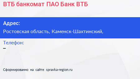 ВТБ, банкомат, ПАО Банк ВТБ по адресу Ростовская область, Каменск-Шахтинский, в дальнейшем Организация, размещена в следующих категориях: