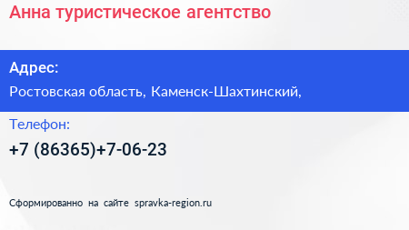 Анна, туристическое агентство по адресу Ростовская область, Каменск-Шахтинский, в дальнейшем Организация, размещена в следующих категориях: