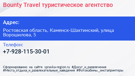 Bounty Travel, туристическое агентство по адресу Ростовская область, Каменск-Шахтинский, улица Ворошилова, 5 в дальнейшем Организация, размещена в следующих категориях: