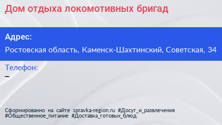 Дом отдыха локомотивных бригад по адресу Ростовская область, Каменск-Шахтинский, Советская, 34 в дальнейшем Организация, размещена в следующих категориях: