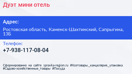 Дуэт, мини-отель по адресу Ростовская область, Каменск-Шахтинский, Сапрыгина, 13Б в дальнейшем Организация, размещена в следующих категориях: