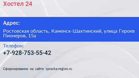 Хостел 24 по адресу Ростовская область, Каменск-Шахтинский, улица Героев Пионеров, 15а в дальнейшем Организация, размещена в следующих категориях: