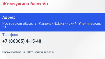 Жемчужина, бассейн по адресу Ростовская область, Каменск-Шахтинский, Ученическая, 5а в дальнейшем Организация, размещена в следующих категориях: