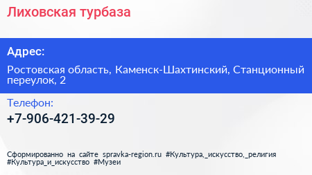 Лиховская, турбаза по адресу Ростовская область, Каменск-Шахтинский, Станционный переулок, 2 в дальнейшем Организация, размещена в следующих категориях: