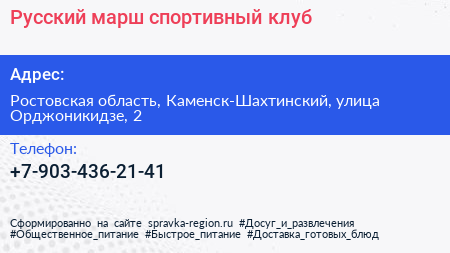 Русский марш, спортивный клуб по адресу Ростовская область, Каменск-Шахтинский, улица Орджоникидзе, 2 в дальнейшем Организация, размещена в следующих категориях: