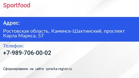 Sportfood по адресу Ростовская область, Каменск-Шахтинский, проспект Карла Маркса, 57 в дальнейшем Организация, размещена в следующих категориях:
