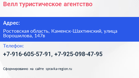 Велл, туристическое агентство по адресу Ростовская область, Каменск-Шахтинский, улица Ворошилова, 147в в дальнейшем Организация, размещена в следующих категориях: