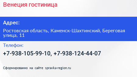 Венеция, гостиница по адресу Ростовская область, Каменск-Шахтинский, Береговая улица, 11 в дальнейшем Организация, размещена в следующих категориях: