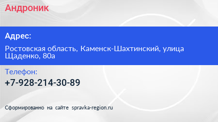 Андроник по адресу Ростовская область, Каменск-Шахтинский, улица Щаденко, 80а в дальнейшем Организация, размещена в следующих категориях: