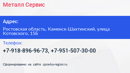 Металл-Сервис по адресу Ростовская область, Каменск-Шахтинский, улица Котовского, 15Б в дальнейшем Организация, размещена в следующих категориях: