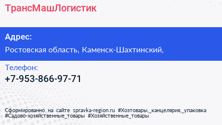 ТрансМашЛогистик по адресу Ростовская область, Каменск-Шахтинский, в дальнейшем Организация, размещена в следующих категориях:
