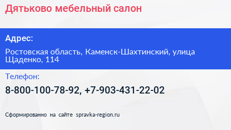 Дятьково, мебельный салон по адресу Ростовская область, Каменск-Шахтинский, улица Щаденко, 114 в дальнейшем Организация, размещена в следующих категориях: