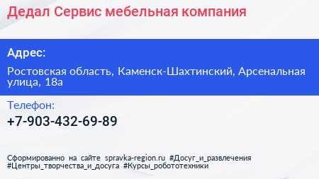 Дедал-Сервис, мебельная компания по адресу Ростовская область, Каменск-Шахтинский, Арсенальная улица, 18а в дальнейшем Организация, размещена в следующих категориях: