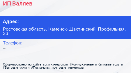 ИП Валяев по адресу Ростовская область, Каменск-Шахтинский, Профильная, 33 в дальнейшем Организация, размещена в следующих категориях: