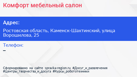 Комфорт, мебельный салон по адресу Ростовская область, Каменск-Шахтинский, улица Ворошилова, 25 в дальнейшем Организация, размещена в следующих категориях: