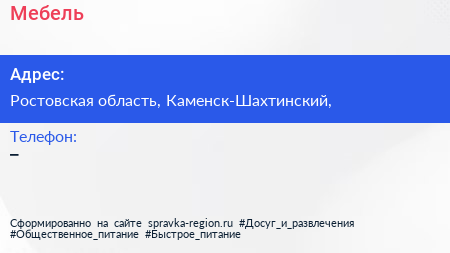 Мебель по адресу Ростовская область, Каменск-Шахтинский, в дальнейшем Организация, размещена в следующих категориях: