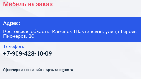 Мебель на заказ по адресу Ростовская область, Каменск-Шахтинский, улица Героев Пионеров, 20 в дальнейшем Организация, размещена в следующих категориях: