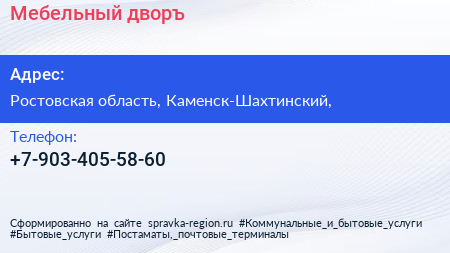 Мебельный дворъ по адресу Ростовская область, Каменск-Шахтинский, в дальнейшем Организация, размещена в следующих категориях: