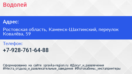 Водолей по адресу Ростовская область, Каменск-Шахтинский, переулок Ковалёва, 59 в дальнейшем Организация, размещена в следующих категориях: