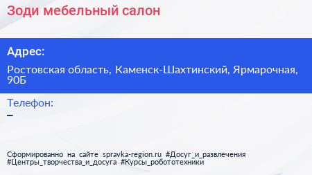 Зоди, мебельный салон по адресу Ростовская область, Каменск-Шахтинский, Ярмарочная, 90Б в дальнейшем Организация, размещена в следующих категориях: