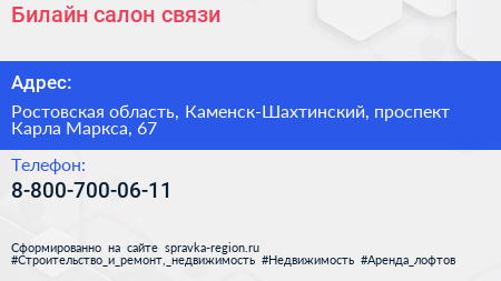 Билайн, салон связи по адресу Ростовская область, Каменск-Шахтинский, проспект Карла Маркса, 67 в дальнейшем Организация, размещена в следующих категориях: