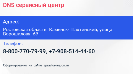 DNS, сервисный центр по адресу Ростовская область, Каменск-Шахтинский, улица Ворошилова, 69 в дальнейшем Организация, размещена в следующих категориях: