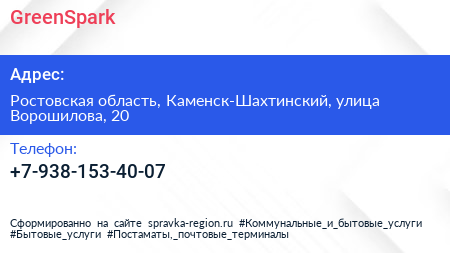 GreenSpark по адресу Ростовская область, Каменск-Шахтинский, улица Ворошилова, 20 в дальнейшем Организация, размещена в следующих категориях: