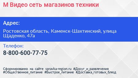 М.Видео, сеть магазинов техники по адресу Ростовская область, Каменск-Шахтинский, улица Щаденко, 47а в дальнейшем Организация, размещена в следующих категориях: