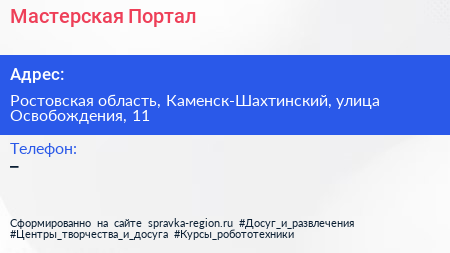 Мастерская Портал по адресу Ростовская область, Каменск-Шахтинский, улица Освобождения, 11 в дальнейшем Организация, размещена в следующих категориях: