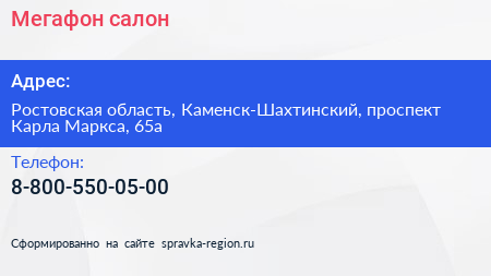 Мегафон, салон по адресу Ростовская область, Каменск-Шахтинский, проспект Карла Маркса, 65а в дальнейшем Организация, размещена в следующих категориях: