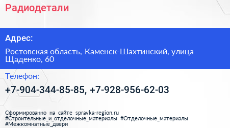 Радиодетали по адресу Ростовская область, Каменск-Шахтинский, улица Щаденко, 60 в дальнейшем Организация, размещена в следующих категориях: