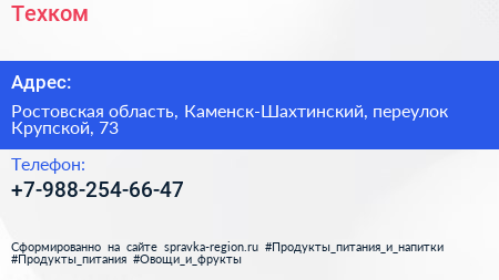 Техком по адресу Ростовская область, Каменск-Шахтинский, переулок Крупской, 73 в дальнейшем Организация, размещена в следующих категориях:
