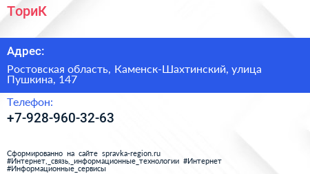 ТориК по адресу Ростовская область, Каменск-Шахтинский, улица Пушкина, 147 в дальнейшем Организация, размещена в следующих категориях:
