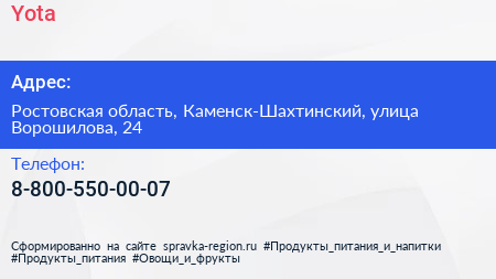 Yota по адресу Ростовская область, Каменск-Шахтинский, улица Ворошилова, 24 в дальнейшем Организация, размещена в следующих категориях: