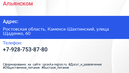 Альянском по адресу Ростовская область, Каменск-Шахтинский, улица Щаденко, 60 в дальнейшем Организация, размещена в следующих категориях: