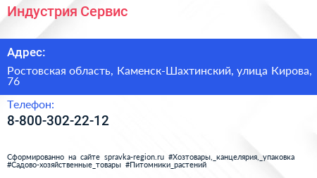 Индустрия Сервис по адресу Ростовская область, Каменск-Шахтинский, улица Кирова, 76 в дальнейшем Организация, размещена в следующих категориях: