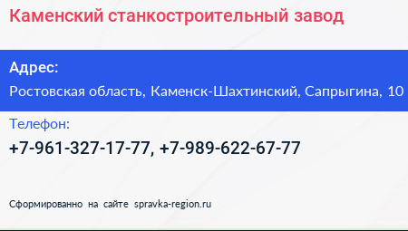 Каменский станкостроительный завод по адресу Ростовская область, Каменск-Шахтинский, Сапрыгина, 10 в дальнейшем Организация, размещена в следующих категориях: