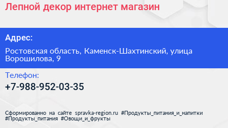 Лепной декор, интернет-магазин по адресу Ростовская область, Каменск-Шахтинский, улица Ворошилова, 9 в дальнейшем Организация, размещена в следующих категориях: