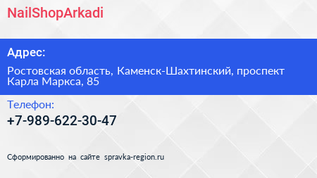 NailShopArkadi по адресу Ростовская область, Каменск-Шахтинский, проспект Карла Маркса, 85 в дальнейшем Организация, размещена в следующих категориях: