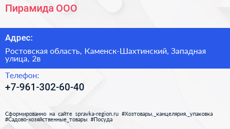 Пирамида, ООО по адресу Ростовская область, Каменск-Шахтинский, Западная улица, 2в в дальнейшем Организация, размещена в следующих категориях: