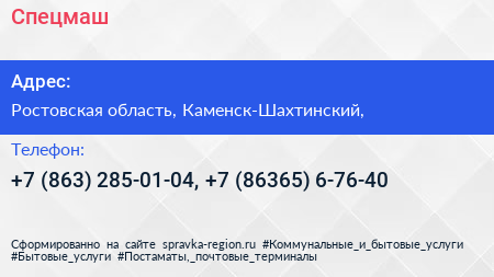 Спецмаш по адресу Ростовская область, Каменск-Шахтинский, в дальнейшем Организация, размещена в следующих категориях: