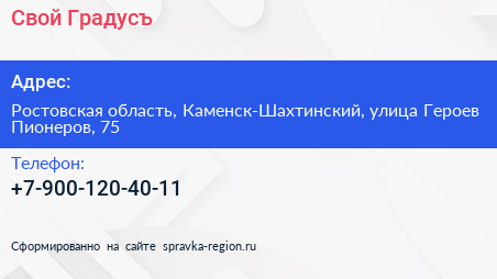 Свой-Градусъ по адресу Ростовская область, Каменск-Шахтинский, улица Героев Пионеров, 75 в дальнейшем Организация, размещена в следующих категориях:
