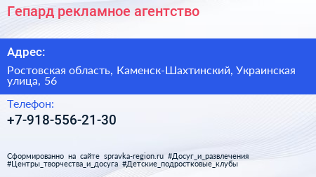 Гепард, рекламное агентство по адресу Ростовская область, Каменск-Шахтинский, Украинская улица, 56 в дальнейшем Организация, размещена в следующих категориях:
