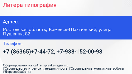 Литера, типография по адресу Ростовская область, Каменск-Шахтинский, улица Пушкина, 82 в дальнейшем Организация, размещена в следующих категориях: