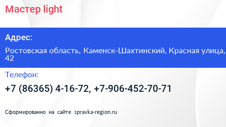 Мастер light по адресу Ростовская область, Каменск-Шахтинский, Красная улица, 42 в дальнейшем Организация, размещена в следующих категориях: