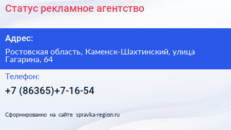 Статус, рекламное агентство по адресу Ростовская область, Каменск-Шахтинский, улица Гагарина, 64 в дальнейшем Организация, размещена в следующих категориях: