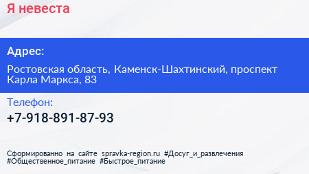 Я невеста по адресу Ростовская область, Каменск-Шахтинский, проспект Карла Маркса, 83 в дальнейшем Организация, размещена в следующих категориях: