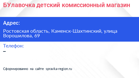 БУлавочка, детский комиссионный магазин по адресу Ростовская область, Каменск-Шахтинский, улица Ворошилова, 69 в дальнейшем Организация, размещена в следующих категориях: