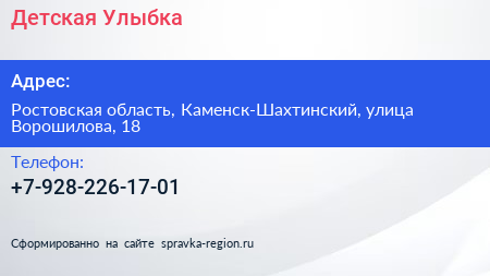Детская Улыбка по адресу Ростовская область, Каменск-Шахтинский, улица Ворошилова, 18 в дальнейшем Организация, размещена в следующих категориях: