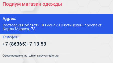 Подиум, магазин одежды по адресу Ростовская область, Каменск-Шахтинский, проспект Карла Маркса, 73 в дальнейшем Организация, размещена в следующих категориях: